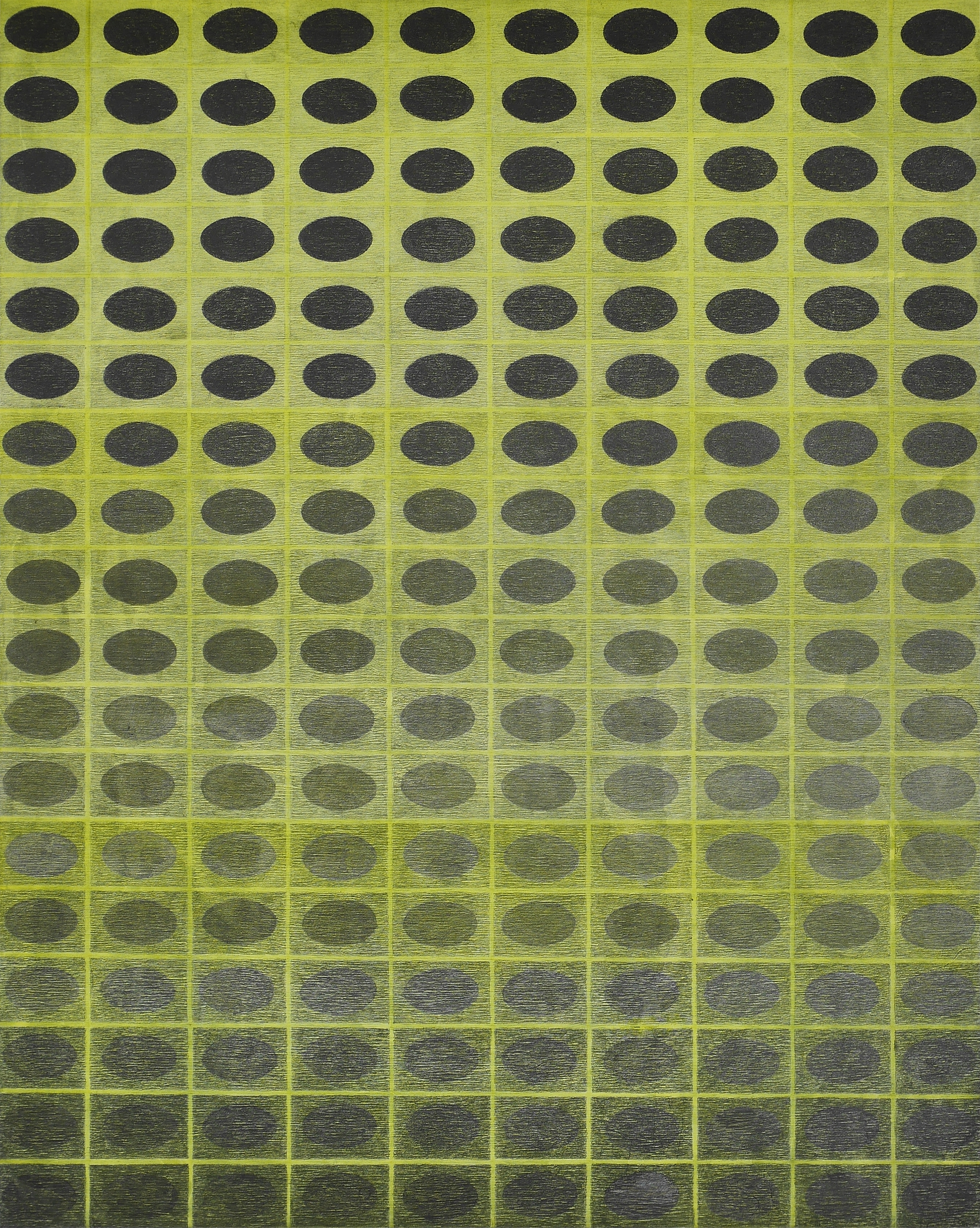 Kristina Paabus uses geometric elements to explore the structure found in the composition of Sonata #6. She utilized different hardness of graphite to create shift in value, reflecting shifts she heard in the tone of music. A shift in visual perception is created through layering and a sense of transparency. The grid format and oval shapes recall the structural elements of the score.
